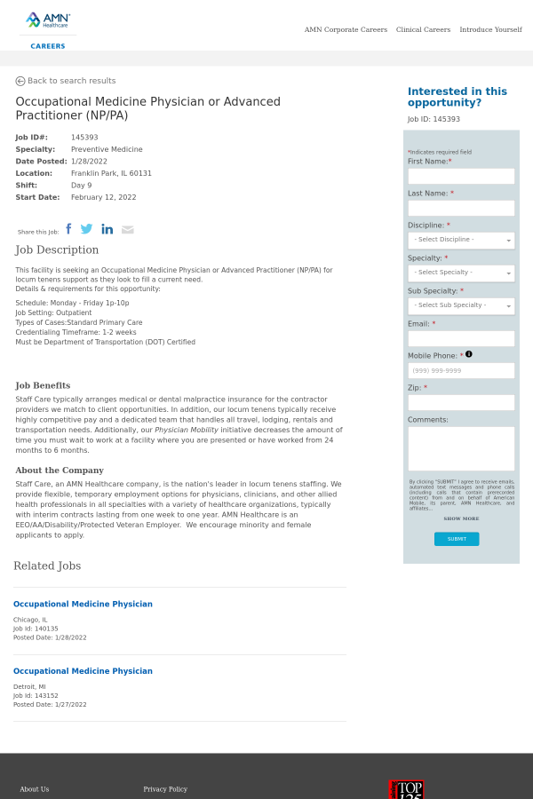 Staff Care, an AMN Healthcare company, is the nation's leader in locum tenens staffing. We provide flexible, temporary employment options for physicians, clinicians, and other allied health professionals in all specialties with a variety of healthcare organizations, typically with interim contracts lasting from one week to one year. AMN Healthcare is an EEO/AA/Disability/Protected Veteran Employer. We encourage minority and female applicants to apply.