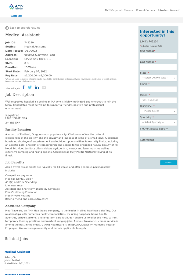 Med Travelers, an AMN Healthcare company, is the leader in allied healthcare staffing. Our relationships with numerous healthcare facilities - including hospitals, home health agencies, school systems, and long-term care facilities - enable us to offer the most current temporary therapy positions and medical imaging jobs. And our traveler customer service is among the best in the industry. AMN Healthcare is an EEO/AA/Disability/Protected Veteran Employer. We encourage minority and female applicants to apply.
