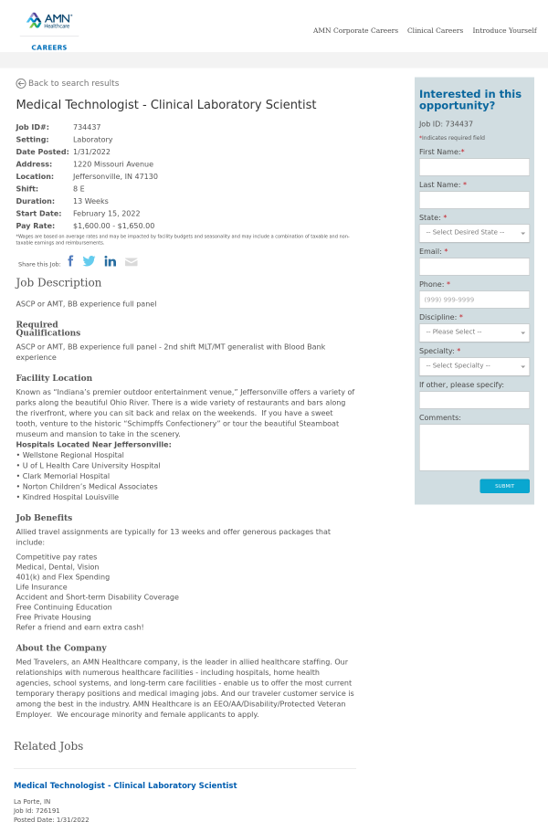 Med Travelers, an AMN Healthcare company, is the leader in allied healthcare staffing. Our relationships with numerous healthcare facilities - including hospitals, home health agencies, school systems, and long-term care facilities - enable us to offer the most current temporary therapy positions and medical imaging jobs. And our traveler customer service is among the best in the industry. AMN Healthcare is an EEO/AA/Disability/Protected Veteran Employer. We encourage minority and female applicants to apply.