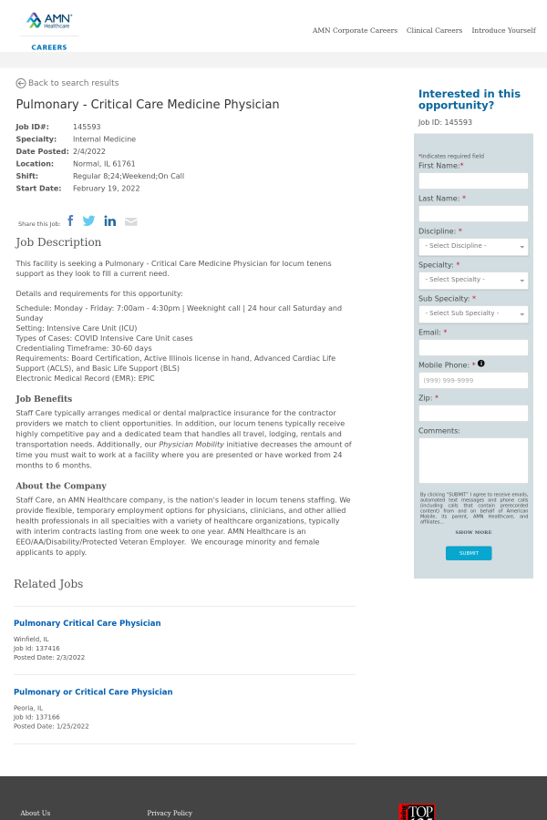Staff Care, an AMN Healthcare company, is the nation's leader in locum tenens staffing. We provide flexible, temporary employment options for physicians, clinicians, and other allied health professionals in all specialties with a variety of healthcare organizations, typically with interim contracts lasting from one week to one year. AMN Healthcare is an EEO/AA/Disability/Protected Veteran Employer. We encourage minority and female applicants to apply.