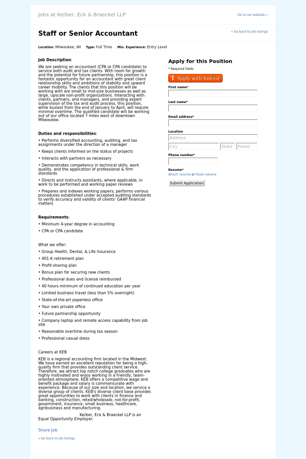 KEB is a regional accounting firm located in the Midwest. We have earned an excellent reputation for being a high-quality firm that provides outstanding client service. Therefore, we attract top notch college graduates who are highly motivated and enjoy working in a friendly, team-oriented atmosphere. KEB offers a competitive wage and benefit package and salary is commensurate with experience. Because of our size and location, we service a diverse group of clients. KEB's diverse client base provides great opportunities to work with clients in finance and banking, construction, retail/wholesale, not-for-profit, government, insurance, small business, healthcare, agribusiness and manufacturing.