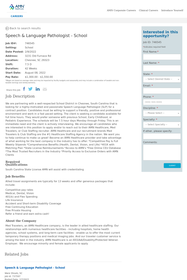 We are partnering with a well-respected School District in Chesnee, South Carolina that is looking for a highly-motivated and passionate Speech Language Pathologist (SLP) for a contract position. Candidates must be willing to support a friendly, positive and professional environment and work in a fast paced setting. The client is seeking a candidate available for full time hours. They would prefer someone with previous School, Early Childhood, or Pediatric Experience. The schedule will be 7.5 hour days Monday through Friday. This is an immediate need and the client is actively interviewing. We encourage all candidates who are interested in this position to apply and/or to reach out to their AMN Healthcare, Med Travelers, or Club Staffing recruiter. AMN Healthcare and our recruitment brands Med Travelers & Club Staffing are the #1 Healthcare Staffing Agency in the nation. We want you to help continue to make us great! Become an AMN Healthcare provider and take advantage of what working for the best company in the industry has to offer: *Competitive Pay & Full Weekly Stipends *Comprehensive Benefits (Health, Dental, Vision, and Life) *401K with Matching Plan *State License Reimbursements *Access to AMN's *Free Online CEU Database *The Most Trusted Recruiters in the Industry *Priority Access to Exclusive Orders with AMN Clients