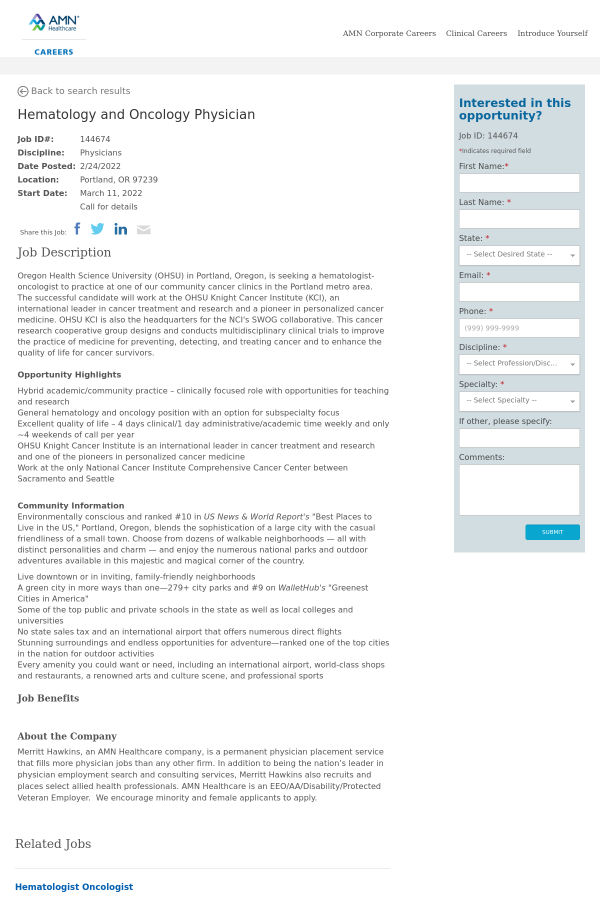 Merritt Hawkins, an AMN Healthcare company, is a permanent physician placement service that fills more physician jobs than any other firm. In addition to being the nation’s leader in physician employment search and consulting services, Merritt Hawkins also recruits and places select allied health professionals. AMN Healthcare is an EEO/AA/Disability/Protected Veteran Employer. We encourage minority and female applicants to apply.
