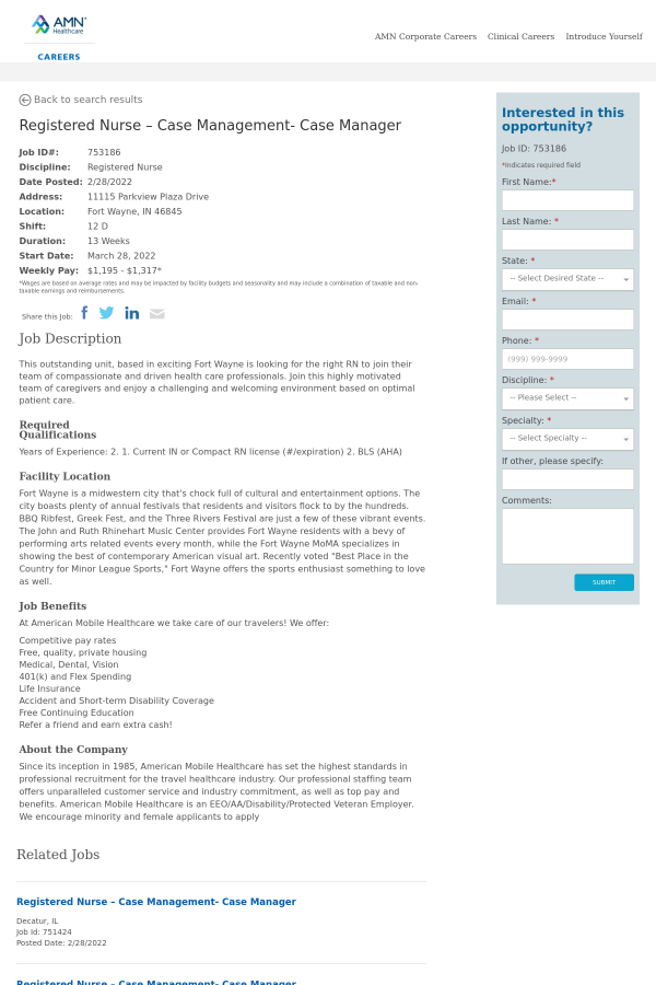 Since its inception in 1985, American Mobile Healthcare has set the highest standards in professional recruitment for the travel healthcare industry. Our professional staffing team offers unparalleled customer service and industry commitment, as well as top pay and benefits. American Mobile Healthcare is an EEO/AA/Disability/Protected Veteran Employer. We encourage minority and female applicants to apply