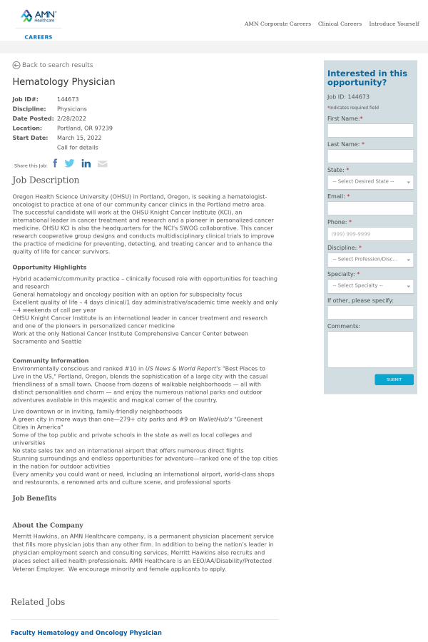 Merritt Hawkins, an AMN Healthcare company, is a permanent physician placement service that fills more physician jobs than any other firm. In addition to being the nation’s leader in physician employment search and consulting services, Merritt Hawkins also recruits and places select allied health professionals. AMN Healthcare is an EEO/AA/Disability/Protected Veteran Employer. We encourage minority and female applicants to apply.