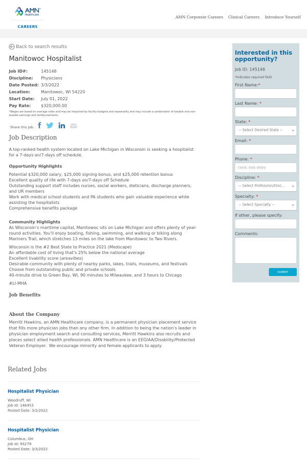 Merritt Hawkins, an AMN Healthcare company, is a permanent physician placement service that fills more physician jobs than any other firm. In addition to being the nation’s leader in physician employment search and consulting services, Merritt Hawkins also recruits and places select allied health professionals. AMN Healthcare is an EEO/AA/Disability/Protected Veteran Employer. We encourage minority and female applicants to apply.