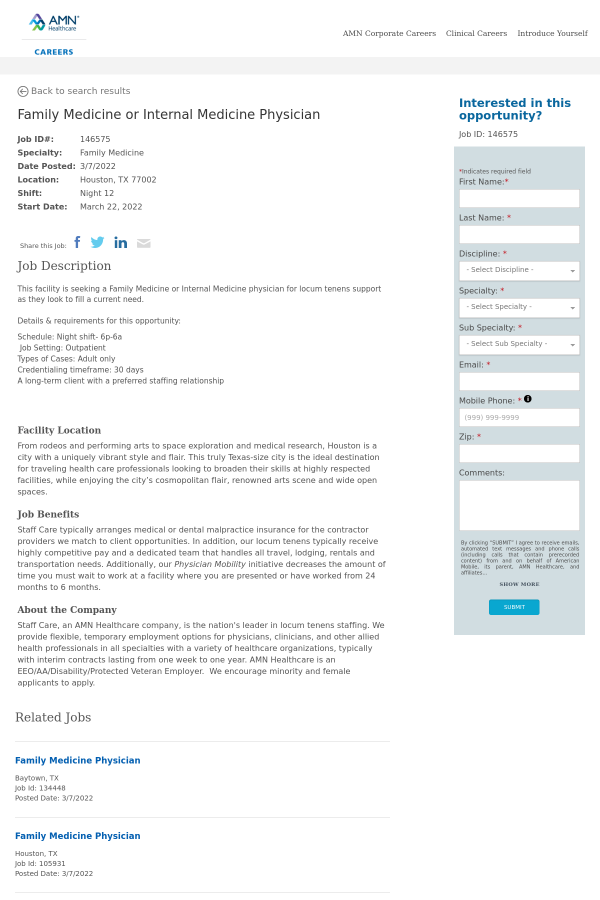 Staff Care, an AMN Healthcare company, is the nation's leader in locum tenens staffing. We provide flexible, temporary employment options for physicians, clinicians, and other allied health professionals in all specialties with a variety of healthcare organizations, typically with interim contracts lasting from one week to one year. AMN Healthcare is an EEO/AA/Disability/Protected Veteran Employer. We encourage minority and female applicants to apply.