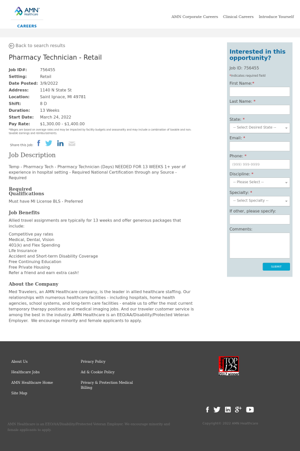 Med Travelers, an AMN Healthcare company, is the leader in allied healthcare staffing. Our relationships with numerous healthcare facilities - including hospitals, home health agencies, school systems, and long-term care facilities - enable us to offer the most current temporary therapy positions and medical imaging jobs. And our traveler customer service is among the best in the industry. AMN Healthcare is an EEO/AA/Disability/Protected Veteran Employer. We encourage minority and female applicants to apply.