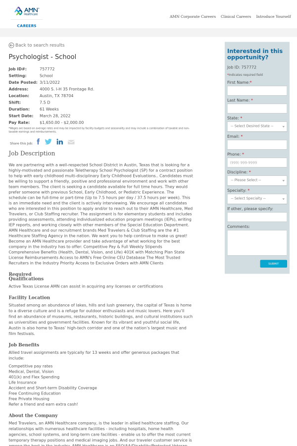 We are partnering with a well-respected School District in Austin, Texas that is looking for a highly-motivated and passionate Teletherapy School Psychologist (SP) for a contract position to help with early childhood multi-disciplinary Early Childhood Evaluations.. Candidates must be willing to support a friendly, positive and professional environment and work with other team members. The client is seeking a candidate available for full time hours. They would prefer someone with previous School, Early Childhood, or Pediatric Experience. The schedule can be full-time or part-time (Up to 7.5 hours per day / 37.5 hours per week). This is an immediate need and the client is actively interviewing. We encourage all candidates who are interested in this position to apply and/or to reach out to their AMN Healthcare, Med Travelers, or Club Staffing recruiter. The assignment is for elementary students and includes providing assessments, attending individualized education program meetings (IEPs), writing IEP reports, and working closely with other members of the Special Education Department. AMN Healthcare and our recruitment brands Med Travelers & Club Staffing are the #1 Healthcare Staffing Agency in the nation. We want you to help continue to make us great! Become an AMN Healthcare provider and take advantage of what working for the best company in the industry has to offer: Competitive Pay & Full Weekly Stipends Comprehensive Benefits (Health, Dental, Vision, and Life) 401K with Matching Plan State License Reimbursements Access to AMN's Free Online CEU Database The Most Trusted Recruiters in the Industry Priority Access to Exclusive Orders with AMN Clients
