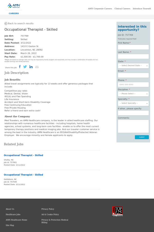 Med Travelers, an AMN Healthcare company, is the leader in allied healthcare staffing. Our relationships with numerous healthcare facilities - including hospitals, home health agencies, school systems, and long-term care facilities - enable us to offer the most current temporary therapy positions and medical imaging jobs. And our traveler customer service is among the best in the industry. AMN Healthcare is an EEO/AA/Disability/Protected Veteran Employer. We encourage minority and female applicants to apply.