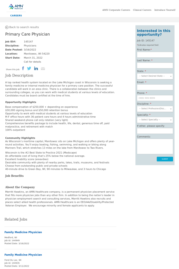 Merritt Hawkins, an AMN Healthcare company, is a permanent physician placement service that fills more physician jobs than any other firm. In addition to being the nation’s leader in physician employment search and consulting services, Merritt Hawkins also recruits and places select allied health professionals. AMN Healthcare is an EEO/AA/Disability/Protected Veteran Employer. We encourage minority and female applicants to apply.