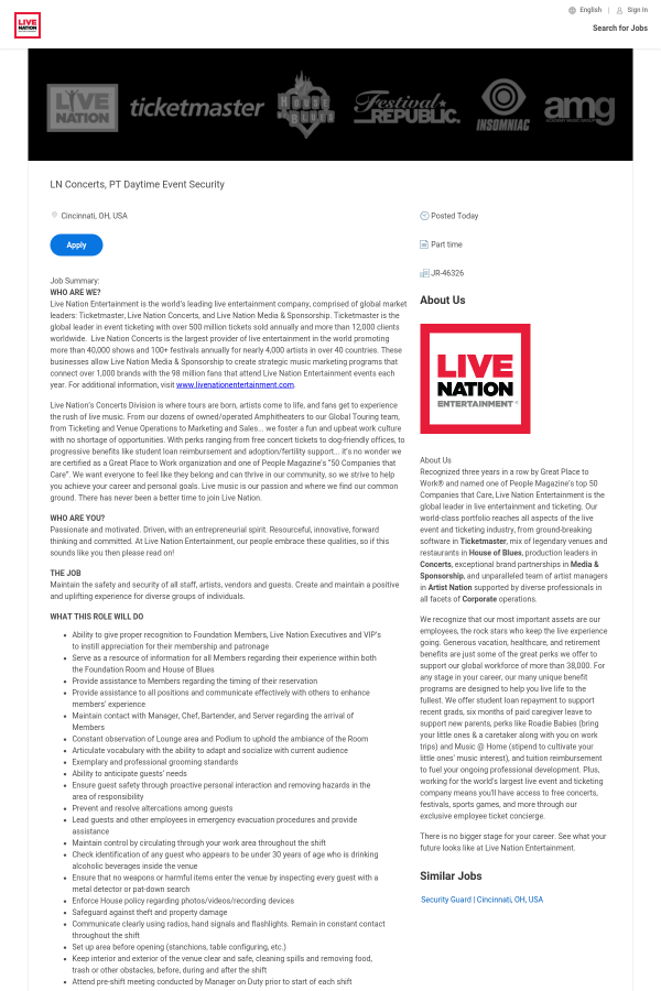 Live Nation’s Concerts Division is where tours are born, artists come to life, and fans get to experience the rush of live music. From our dozens of owned/operated Amphitheaters to our Global Touring team, from Ticketing and Venue Operations to Marketing and Sales... we foster a fun and upbeat work culture with no shortage of opportunities. With perks ranging from free concert tickets to dog-friendly offices, to progressive benefits like student loan reimbursement and adoption/fertility support... it’s no wonder we are certified as a Great Place to Work organization and one of People Magazine’s “50 Companies that Care”. We want everyone to feel like they belong and can thrive in our community, so we strive to help you achieve your career and personal goals. Live music is our passion and where we find our common ground. There has never been a better time to join Live Nation.