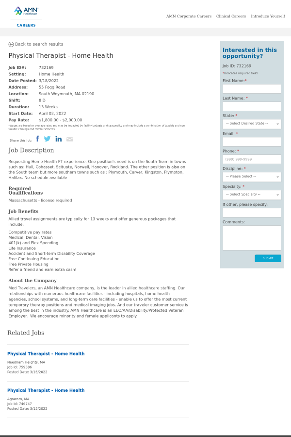 Med Travelers, an AMN Healthcare company, is the leader in allied healthcare staffing. Our relationships with numerous healthcare facilities - including hospitals, home health agencies, school systems, and long-term care facilities - enable us to offer the most current temporary therapy positions and medical imaging jobs. And our traveler customer service is among the best in the industry. AMN Healthcare is an EEO/AA/Disability/Protected Veteran Employer. We encourage minority and female applicants to apply.