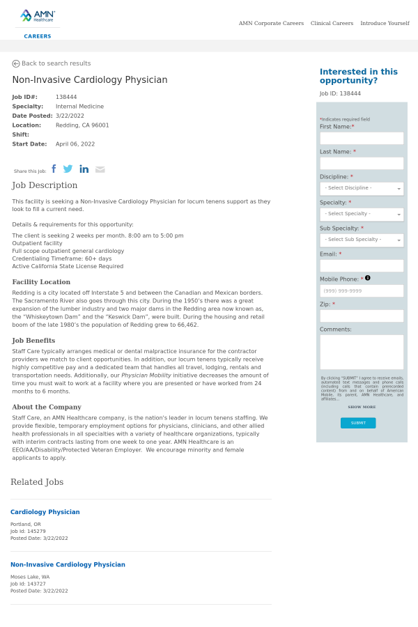 Staff Care, an AMN Healthcare company, is the nation's leader in locum tenens staffing. We provide flexible, temporary employment options for physicians, clinicians, and other allied health professionals in all specialties with a variety of healthcare organizations, typically with interim contracts lasting from one week to one year. AMN Healthcare is an EEO/AA/Disability/Protected Veteran Employer. We encourage minority and female applicants to apply.