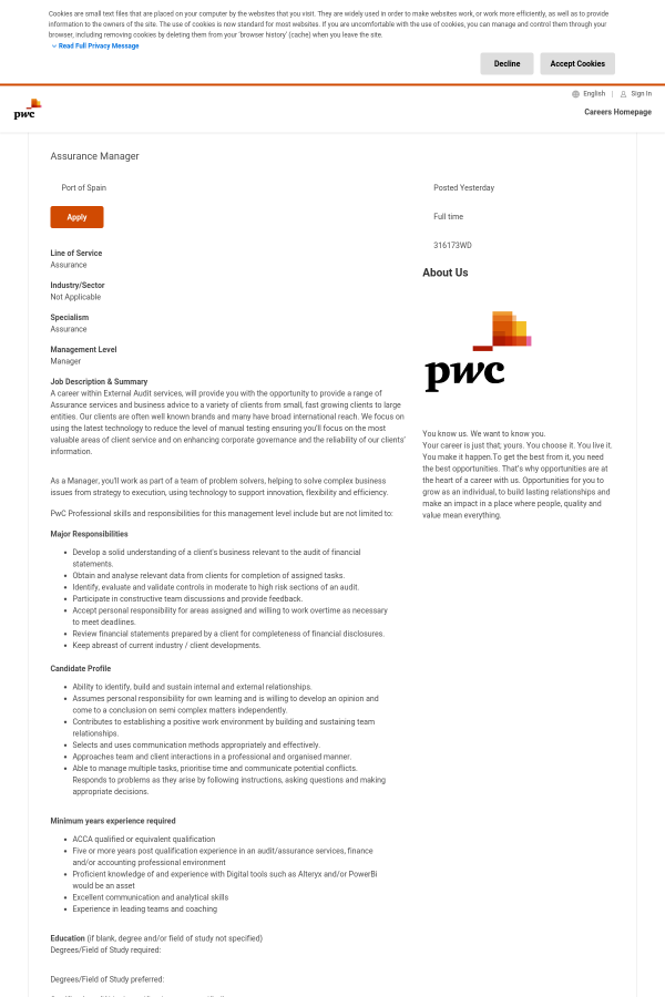 - Five or more years post qualification experience in an audit/assurance services, finance and/or accounting professional environment