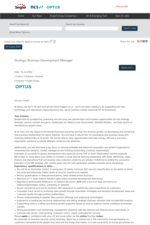 At its core, the role aligns to the desired business outcomes and top line revenue growth, by developing and converting new business relationships for Optus Satellite. You will have a natural flair for developing new business along with fostering relationships at all levels. You will be able to seize opportunities with high energy, efficiency and most importantly resilience to handle different scenarios and obstacles.