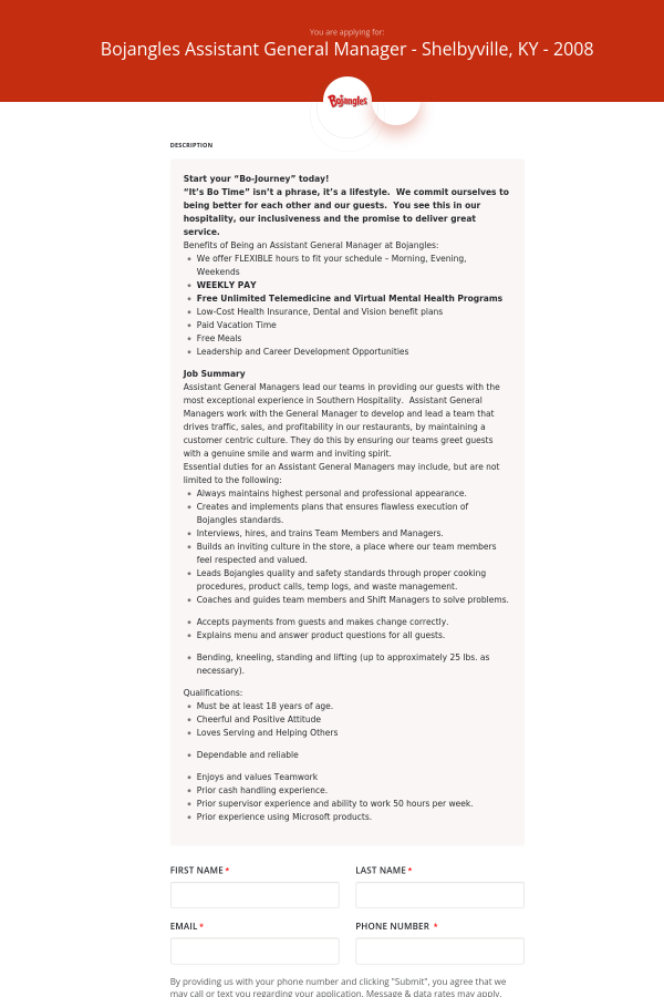Bojangles Assistant General Manager - Shelbyville, KY - 2008