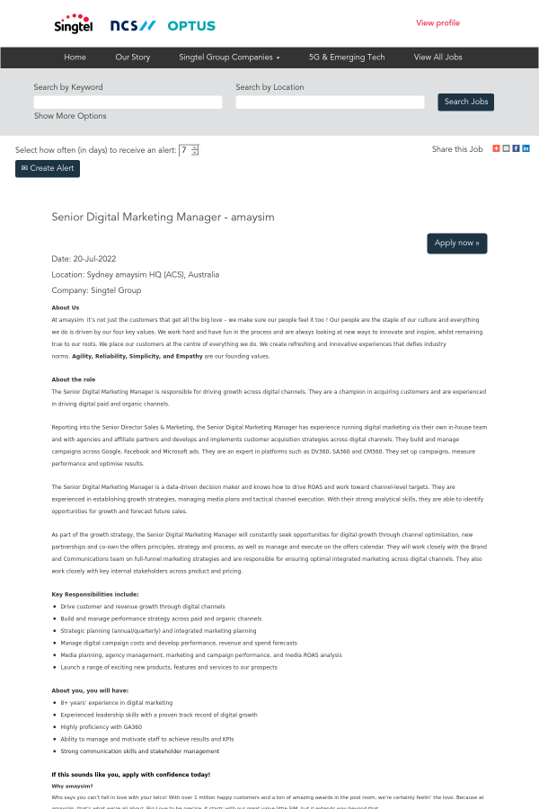 Working at amaysim means you’re part of the Optus family. With a focus on growth, learning and personal development the team at Optus drive an open culture and celebrate individuality. Learn more about #LifeatOptus: https://www.optus.com.au/about/careers/life-at-optus