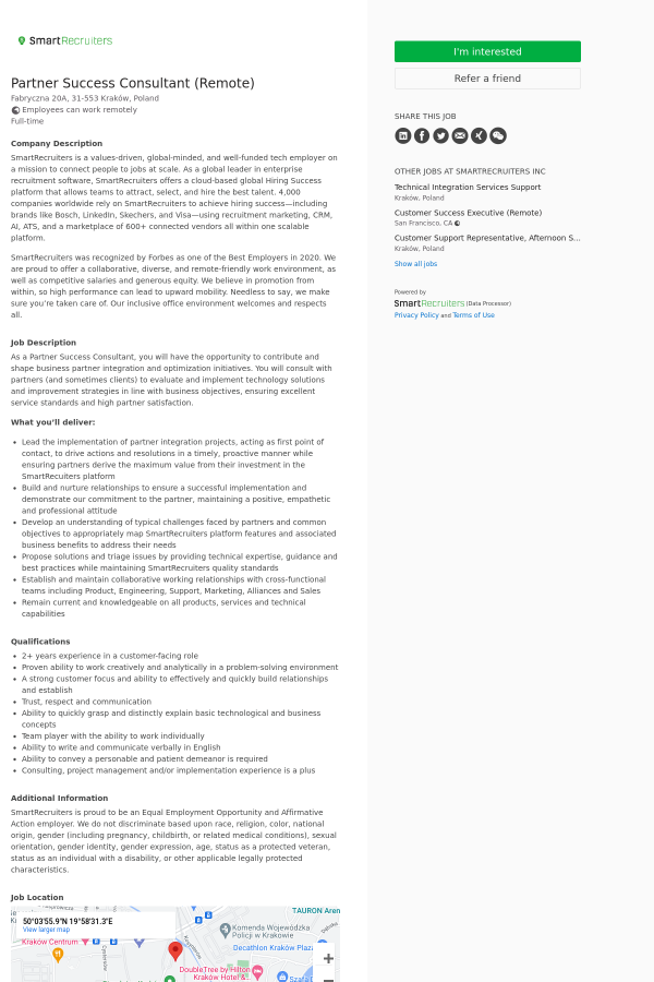 SmartRecruiters is a values-driven, global-minded, and well-funded tech employer on a mission to connect people to jobs at scale. As a global leader in enterprise recruitment software, SmartRecruiters offers a cloud-based global Hiring Success platform that allows teams to attract, select, and hire the best talent. 4,000 companies worldwide rely on SmartRecruiters to achieve hiring success—including brands like Bosch, LinkedIn, Skechers, and Visa—using recruitment marketing, CRM, AI, ATS, and a marketplace of 600+ connected vendors all within one scalable platform.