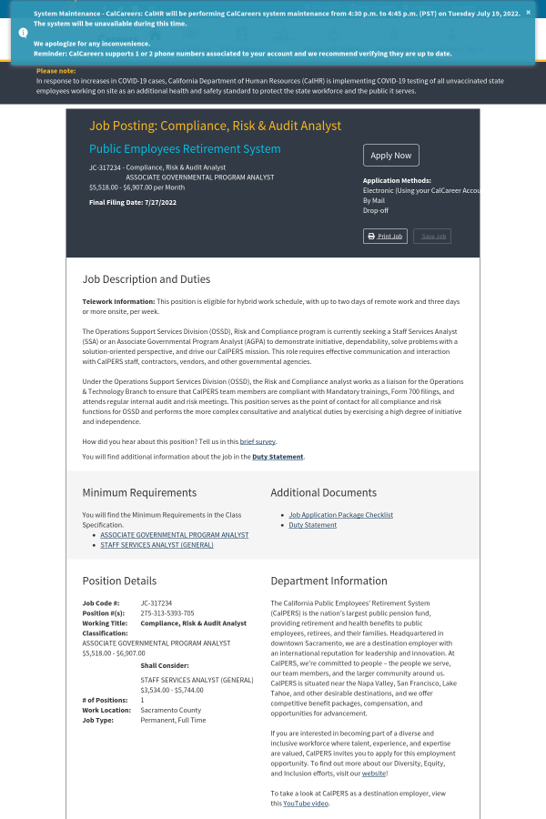 If you are interested in becoming part of a diverse and inclusive workforce where talent, experience, and expertise are valued, CalPERS invites you to apply for this employment opportunity. To find out more about our Diversity, Equity, and Inclusion efforts, visit our website!