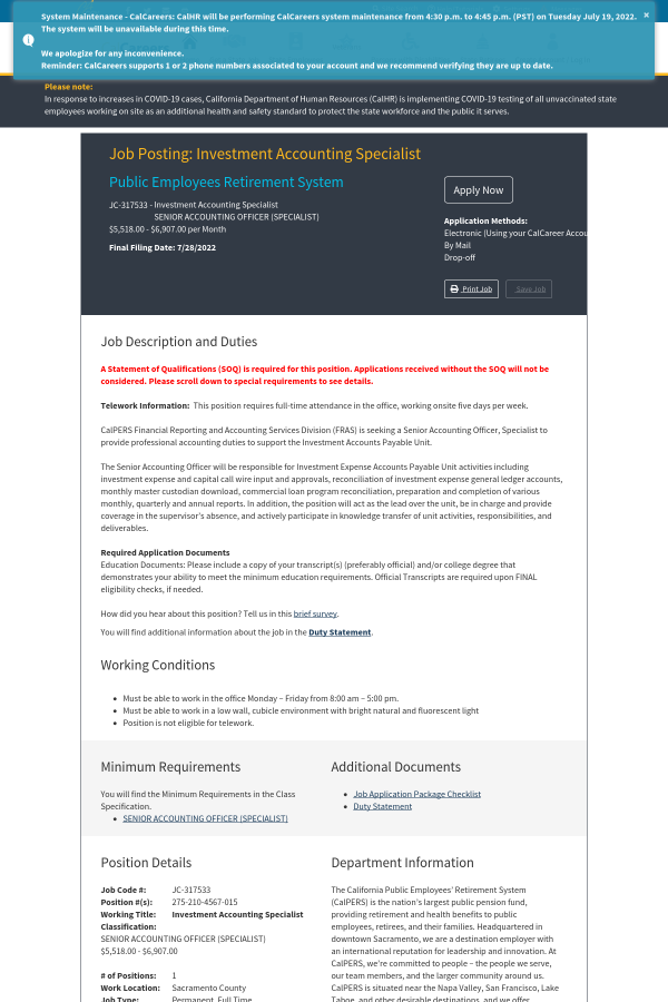 If you are interested in becoming part of a diverse and inclusive workforce where talent, experience, and expertise are valued, CalPERS invites you to apply for this employment opportunity. To find out more about our Diversity, Equity, and Inclusion efforts, visit our website!