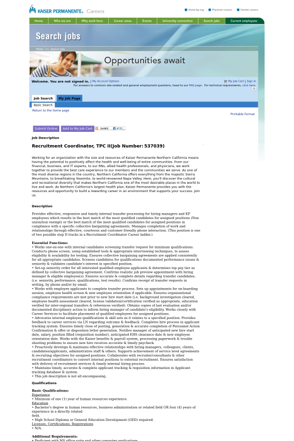 Essential Functions: • Works one-on-one with internal candidates screening transfer request for minimum qualifications. Conducts phone screen, using established tools & appropriate interviewing techniques, to assess eligibility & availability for testing. Ensures collective bargaining agreements are applied consistently for all appropriate candidates. Screens candidates for qualifications documented performance issues & seniority & validates candidate's interest in specified position. • Set-up seniority order for all interested qualified employee applicants & determines top pay tier as defined by collective bargaining agreement. Confirms realistic job preview appointment with hiring manager & eligible employee(s). Ensures accurate & complete details regarding transfer candidates. (i.e. seniority, performance, qualifications, test results). Confirms receipt of transfer requests in writing, by phone and/or by email. • Works with employee applicants to complete transfer process. Sets up appointments for on-boarding session, employee health screen & new employee orientation if applicable. Ensures organizational compliance requirements are met prior to new hire start date (i.e. background investigation cleared, employee health assessment cleared, license validation/certification verified as appropriate, education verified for inter-regional transfers & references verified). Obtains copies of last evaluation and/or documented disciplinary action to inform hiring manager of candidate's eligibility. Works closely with Career Services to facilitate placement of qualified employees for assigned positions. • Advocates internal employee qualifications & skill sets as it relates to a specified position. Provides feedback to career services via LN regarding outcome & feedback. Completes hire process in applicant tracking system. Ensures timely close of posting, generation & accurate completion of Personnel Action Confirmation & offer or disposition letter generation. Notifies manager of anticipated new hire start date, salary, position filled (requisition number), anticipated EHS clearance date & new employee orientation date. Works with the Kaiser benefits & payroll system, processing paperwork & trouble shooting problems to ensure new hire receives accurate & timely paycheck. • Proactively develops & maintains effective relationships with hiring managers, colleagues, clients, candidates/applicants, administrative staff & others. Supports achievement of service level agreements & recruiting objectives for assigned positions. Collaborates with recruiter/consultants & other recruitment coordinators to convert internal positions to external recruitment. Ensures satisfaction with delivery of recruitment services & timely internal hiring process. • Maintains timely, accurate & complete applicant tracking & requisition information in Applicant tracking database & system. • This job description is not all encompassing.