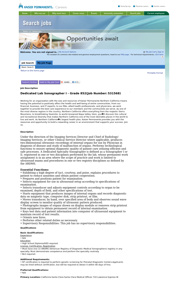 Dedicated Lab Sonographer I - Grade 852 (