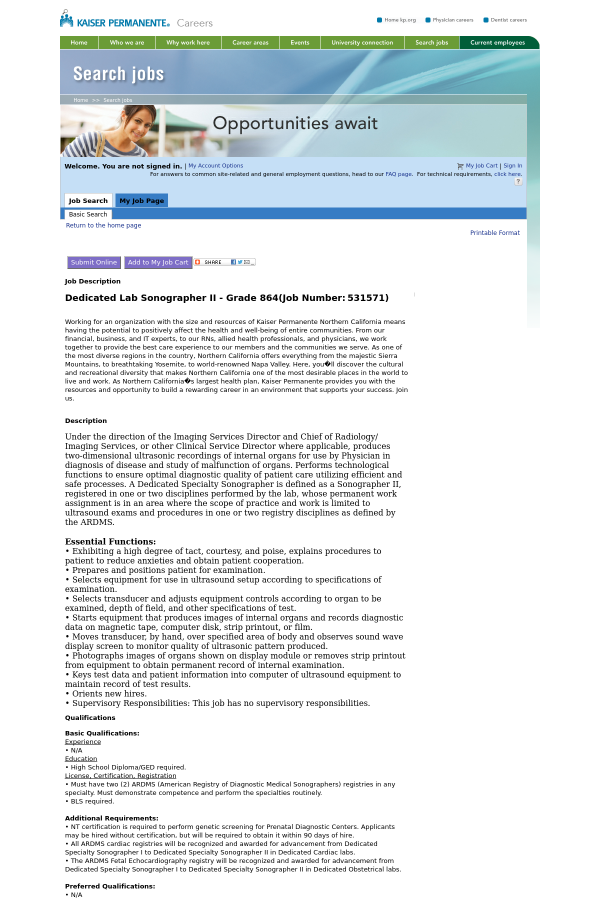 Working for an organization with the size and resources of Kaiser Permanente Northern California means having the potential to positively affect the health and well-being of entire communities. From our financial, business, and IT experts, to our RNs, allied health professionals, and physicians, we work together to provide the best care experience to our members and the communities we serve. As one of the most diverse regions in the country, Northern California offers everything from the majestic Sierra Mountains, to breathtaking Yosemite, to world-renowned Napa Valley. Here, you�ll discover the cultural and recreational diversity that makes Northern California one of the most desirable places in the world to live and work. As Northern California�s largest health plan, Kaiser Permanente provides you with the resources and opportunity to build a rewarding career in an environment that supports your success. Join us.