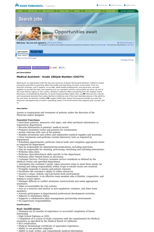 • Minimum six (6) months of experience or successful completion of Kaiser Externship. • High School Diploma or GED. • Completion of a course of study consistent with the requirements for Medical Assistants as specified by the Medical Board of California. • BLS certification. • Medical Terminology Certificate or equivalent experience. • Ability to use personal computer. • Ability to read, writes, and comprehends medical information. • Ability to effectively present information, both verbal and written. • Must be willing to work in a Labor Management Partnership environment. • Refer to Position Specifications outlined in the appropriate collective bargaining agreement.