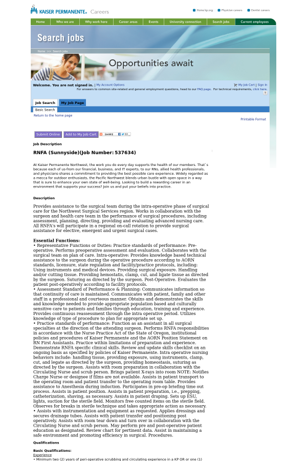 Essential Functions: • Representative Functions or Duties: Practice standards of performance: Pre-operative. Performs preoperative assessment and evaluation. Collaborates with the surgical team on plan of care. Intra-operative: Provides knowledge based technical assistance to the surgeon during the operative procedure according to AORN standards, licensure, state regulation and facility/practice protocols, including: Using instruments and medical devices. Providing surgical exposure. Handling and/or cutting tissue. Providing hemostatis, clamp, cut, and ligate tissue as directed by the surgeon. Suturing as directed by the surgeon. Post-Operative. Evaluates the patient post-operatively according to facility protocols. • Assessment Standard of Performance & Planning: Communicates information so that continuity of care is maintained. Communicates with patient, family and other staff in a professional and courteous manner. Obtains and demonstrates the skills and knowledge needed to provide appropriate population based and culturally sensitive care to patients and families through education, training and experience. Provides continuous reassessment through the intra operative period. Utilizes knowledge of type of procedure to plan for appropriate set up. • Practice standards of performance: Function as an assistant in all surgical specialties at the direction of the attending surgeon. Performs RNFA responsibilities in accordance with the Nurse Practice Act of the State of Oregon, institutional policies and procedures of Kaiser Permanente and the AORN Position Statement on RN First Assistants. Practice within limitations of preparation and experience. Demonstrate RNFA specific clinical skills. Review and update skills checklist on an ongoing basis as specified by policies of Kaiser Permanente. Intra operative nursing behaviors include: handling tissue, providing exposure, using instruments, clamp, cut, and legate as directed by the surgeon, providing homeostasis, suturing as directed by the surgeon. Assists with room preparation in collaboration with the Circulating Nurse and scrub person. Brings patient X-rays into room NOTE: Notifies Charge Nurse or designee if films are not available. Assists in patient transport to the operating room and patient transfer to the operating room table. Provides assistance to Anesthesia during induction. Participates in pre-op briefing time out process. Assists in patient position. Assists in patient preparation, i.e., prepping, catheterization, shaving, as necessary. Assists in patient draping. Sets up ESU, lights, suction for the sterile field. Monitors free counted items on the sterile field. Observes for breaks in sterile technique and takes appropriate action as necessary. • Assists with instrumentation and equipment as requested. Applies dressings and secures drainage tubes. Assists with patient transfer and positioning post operatively. Assists with room tear down and turn over in collaboration with the Circulating Nurse and scrub person. May perform pre and post-operative patient education as designated. Review chart for pertinent data. Assist in maintaining a safe environment and promoting efficiency in surgical. Procedures.