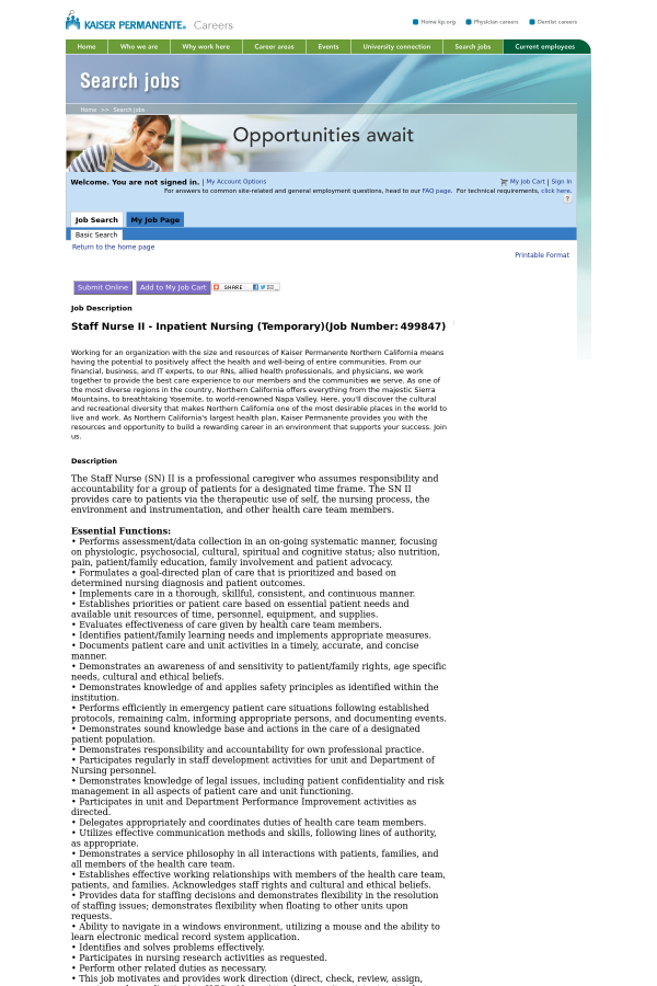 Working for an organization with the size and resources of Kaiser Permanente Northern California means having the potential to positively affect the health and well-being of entire communities. From our financial, business, and IT experts, to our RNs, allied health professionals, and physicians, we work together to provide the best care experience to our members and the communities we serve. As one of the most diverse regions in the country, Northern California offers everything from the majestic Sierra Mountains, to breathtaking Yosemite, to world-renowned Napa Valley. Here, you'll discover the cultural and recreational diversity that makes Northern California one of the most desirable places in the world to live and work. As Northern California's largest health plan, Kaiser Permanente provides you with the resources and opportunity to build a rewarding career in an environment that supports your success. Join us.