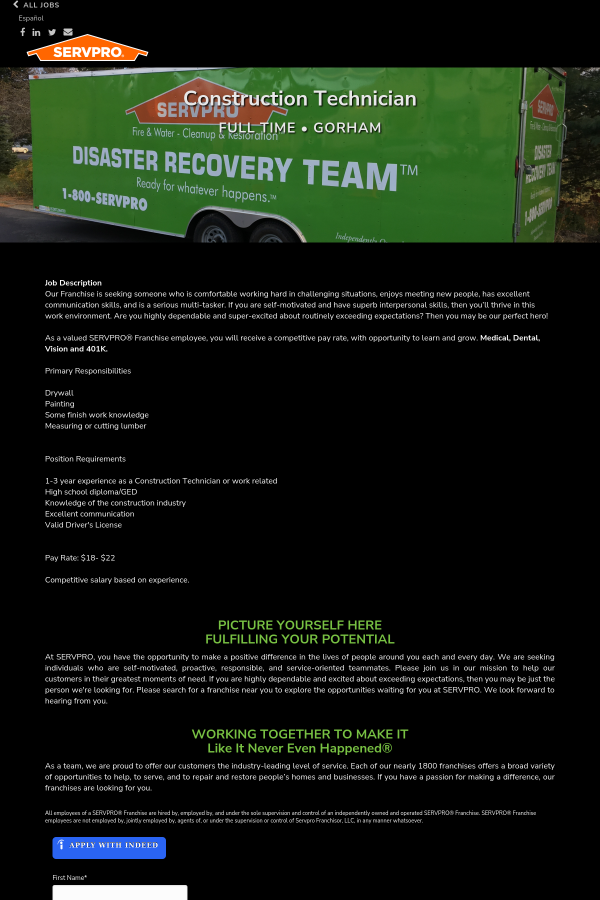 As a valued SERVPRO® Franchise employee, you will receive a competitive pay rate, with opportunity to learn and grow. Medical, Dental, Vision and 401K.