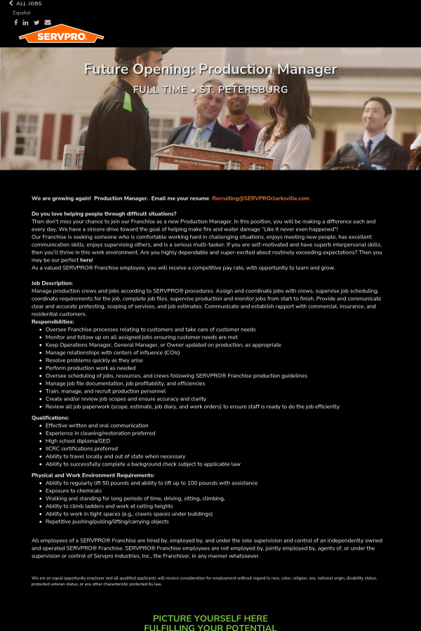 We are growing again! Production Manager. Email me your resume Recruiting@SERVPROclarksville.com