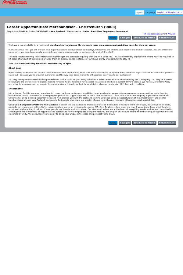 In this essential role, you will work in local supermarkets to build promotional displays, fill shelves and chillers, and execute our brand standards. You will ensure our iconic beverage brands are easily accessible and look fantastic, ready for customers to grab off the shelf!