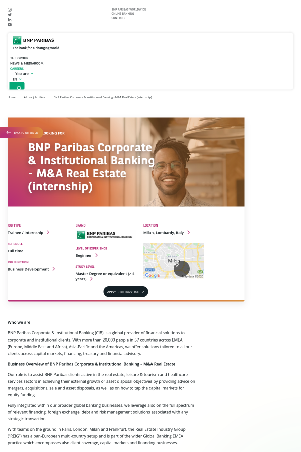 We kindly ask the candidates to register their profile and submit their resume through the BNP Paribas site at the following address: https://www.bnpparibas.it/it/posizioni-aperte/