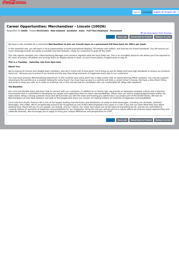 In this essential role, you will work in local supermarkets to build promotional displays, fill shelves and chillers, and execute our brand standards. You will ensure our iconic beverage brands are easily accessible and look fantastic, ready for customers to grab off the shelf!