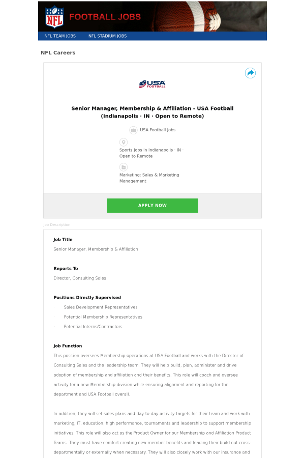 This position oversees Membership operations at USA Football and works with the Director of Consulting Sales and the leadership team. They will help build, plan, administer and drive adoption of membership and affiliation and their benefits. This role will coach and oversee activity for a new Membership division while ensuring alignment and reporting for the department and USA Football overall.