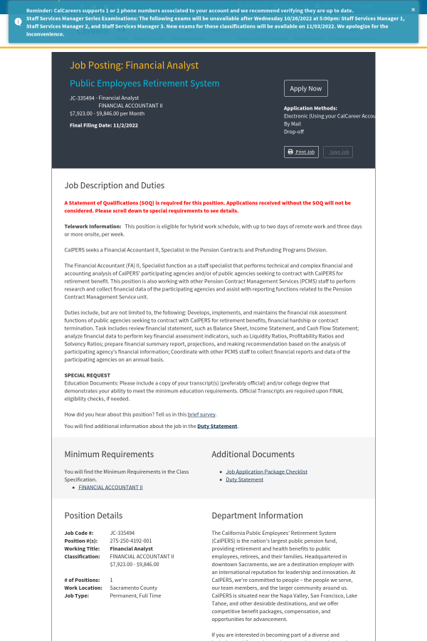 Duties include, but are not limited to, the following: Develops, implements, and maintains the financial risk assessment functions of public agencies seeking to contract with CalPERS for retirement benefits, financial hardship or contract termination. Task includes review financial statement, such as Balance Sheet, Income Statement, and Cash Flow Statement; analyze financial data to perform key financial assessment indicators, such as Liquidity Ratios, Profitability Ratios and Solvency Ratios; prepare financial summary report, projections, and making recommendation based on the analysis of participating agency's financial information; Coordinate with other PCMS staff to collect financial reports and data of the participating agencies on an annual basis.